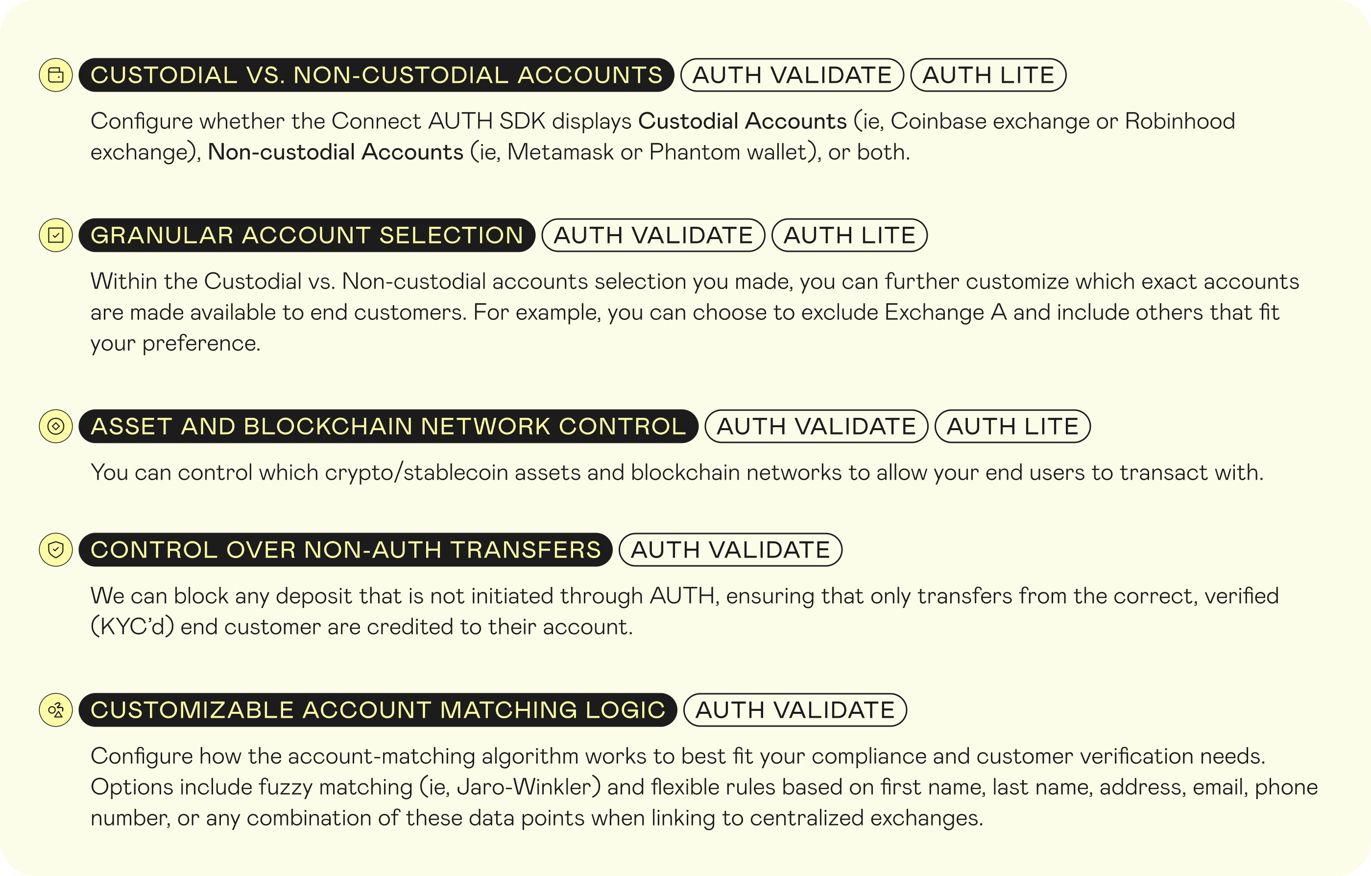 Our Auth product is a seamless and secure solution for enabling direct account-to-account transfers between custodial accounts (ie, exchanges, fintechs, etc) and non-custodial accounts.
