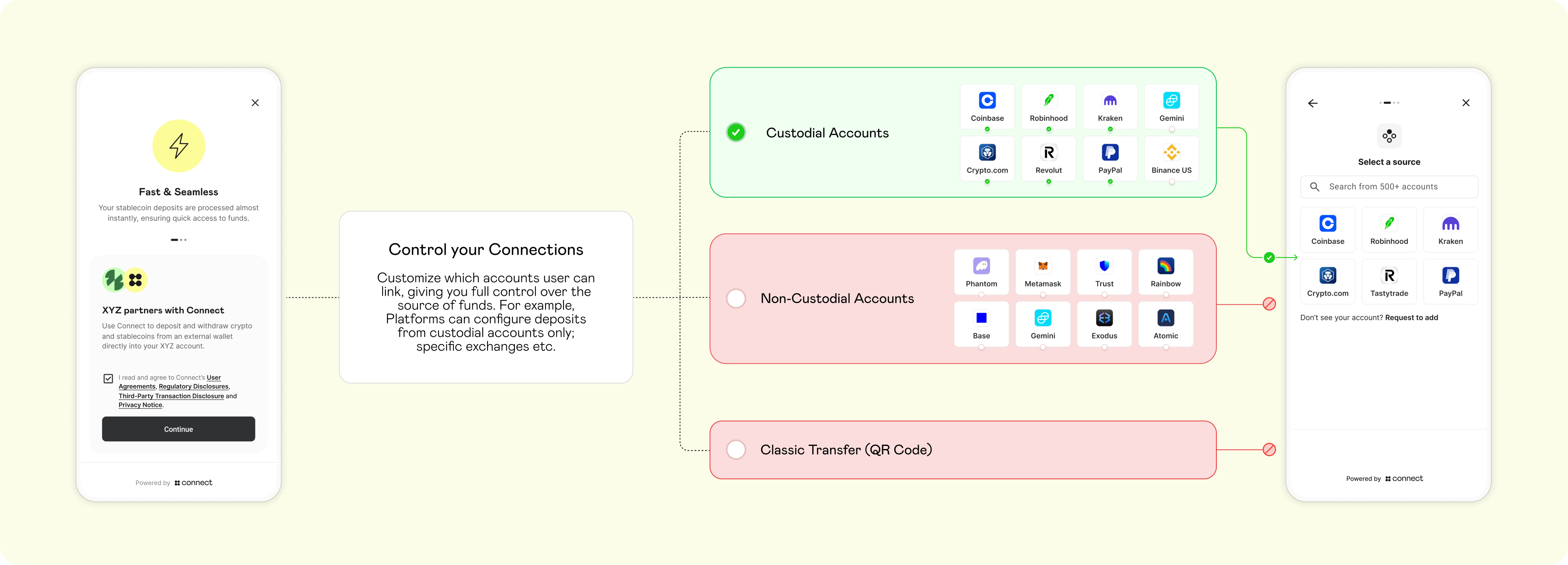 You have complete flexibility to choose which exchange and wallet accounts you want to present as options to your customers: