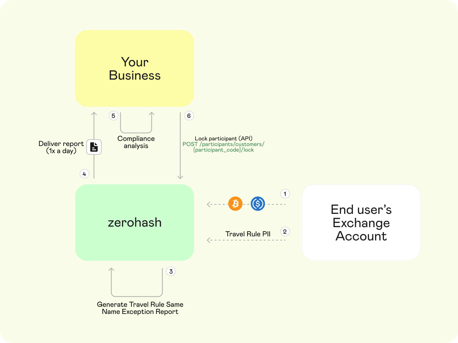 - Travel Rule-Powered Account Match Reporting: As a member of the TRUST network, zerohash can receive sender PII from participating centralized exchanges for transactions above applicable thresholds. This enables post-transaction name matching.