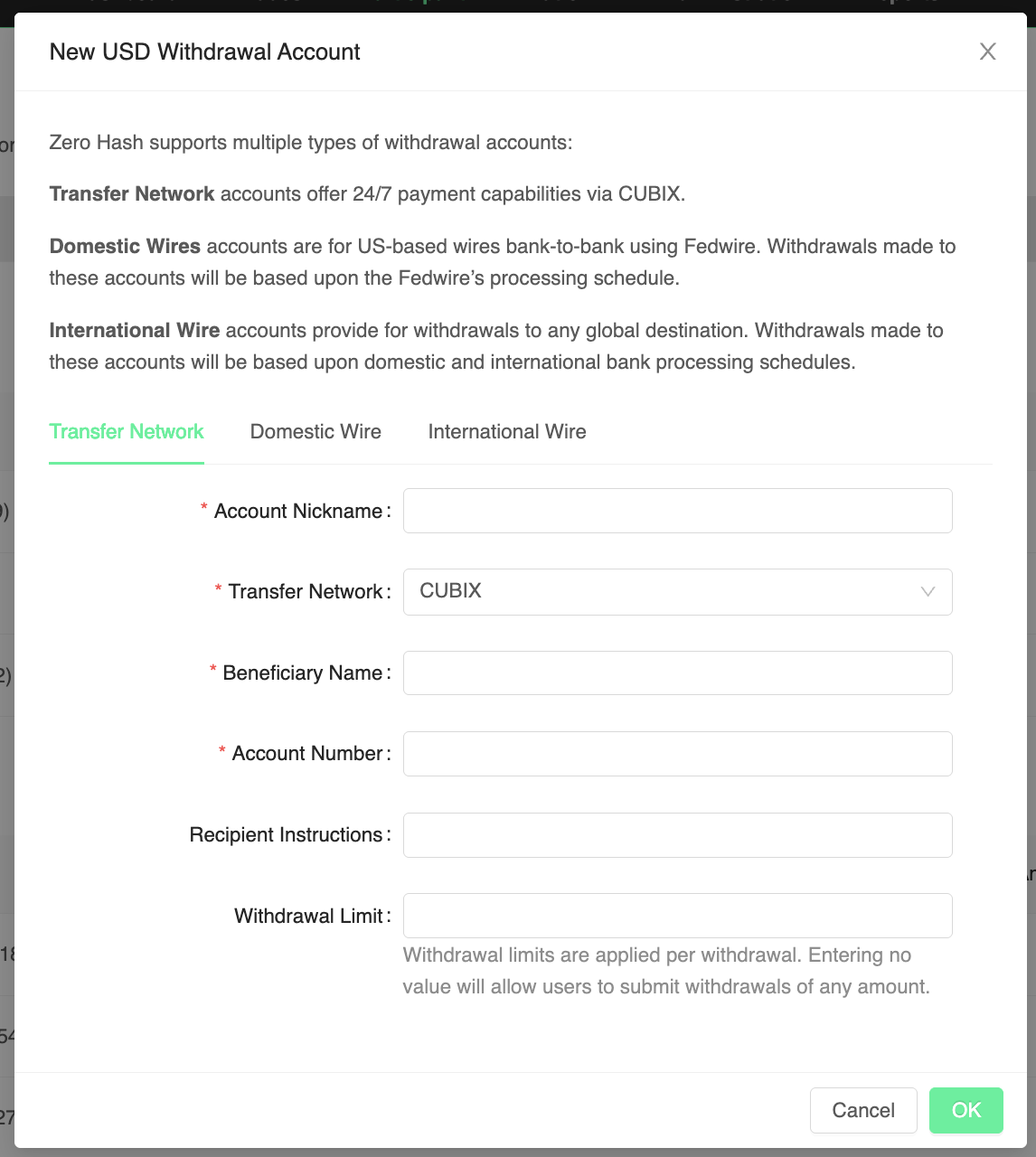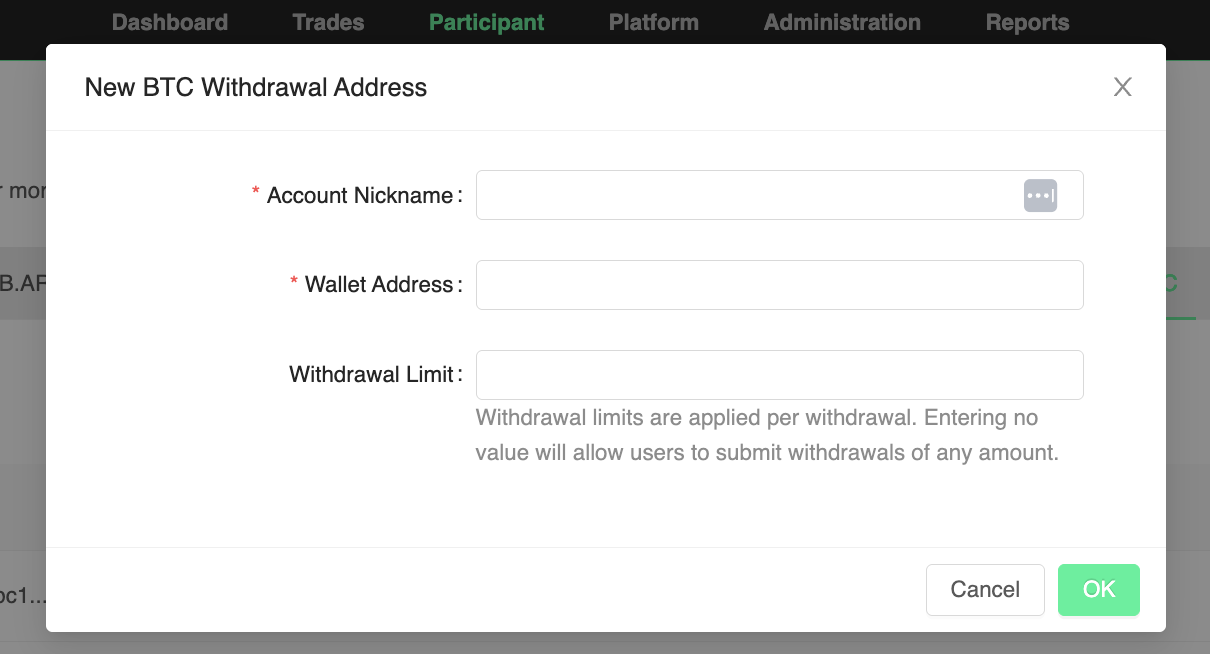 In order to process a withdrawal via the portal, a Withdrawal Account is needed. A Withdrawal Account is a bank account or cryptocurrency address that has been approved by platform admins.