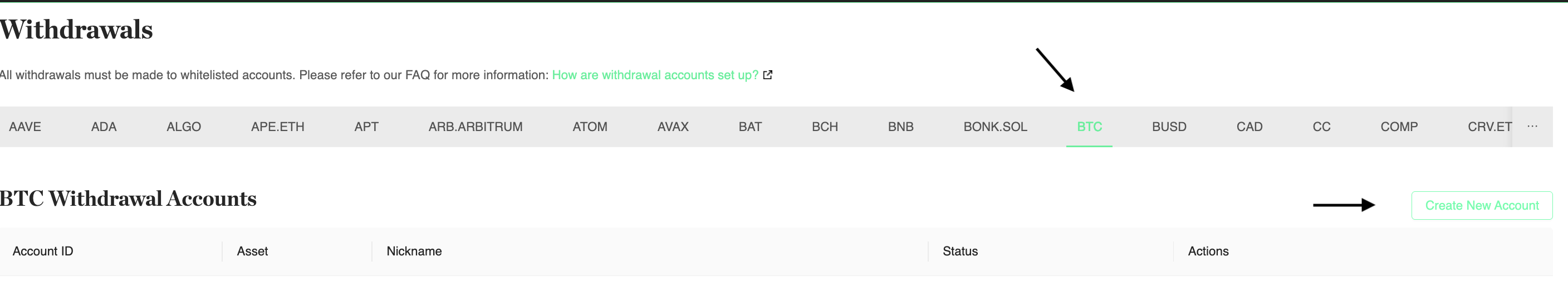 - Select the asset you want to create a withdrawal account for and select Create New Account