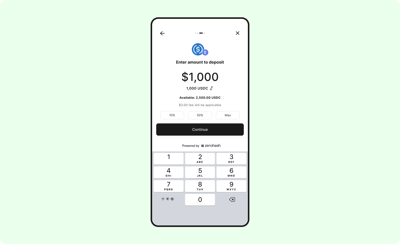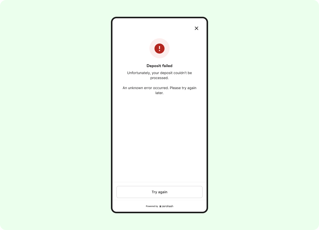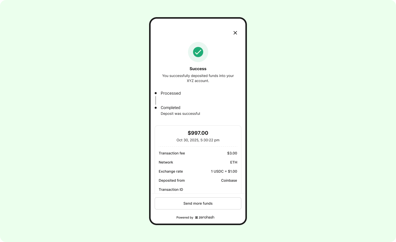 The deposit has now been broadcasted on-chain and is en-route to zerohash. The customer can choose to stay on this screen to monitor the progress, or navigate away (navigating away from this screen will not affect the completion of the deposit):