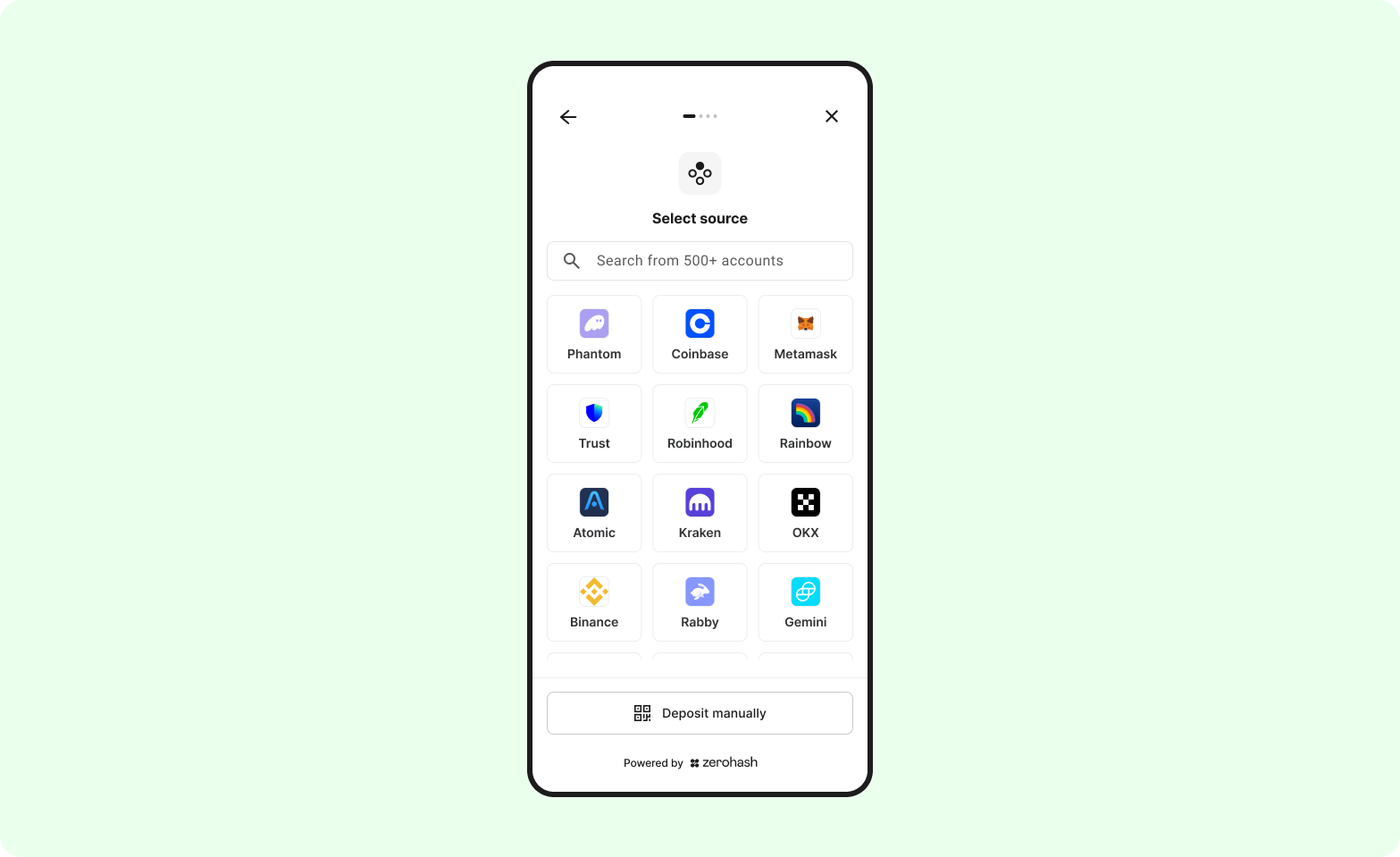 The Menu screen allows the customer select the Auth integration centralized exchange or non-custodial wallet to link and ultimately pull funds from.