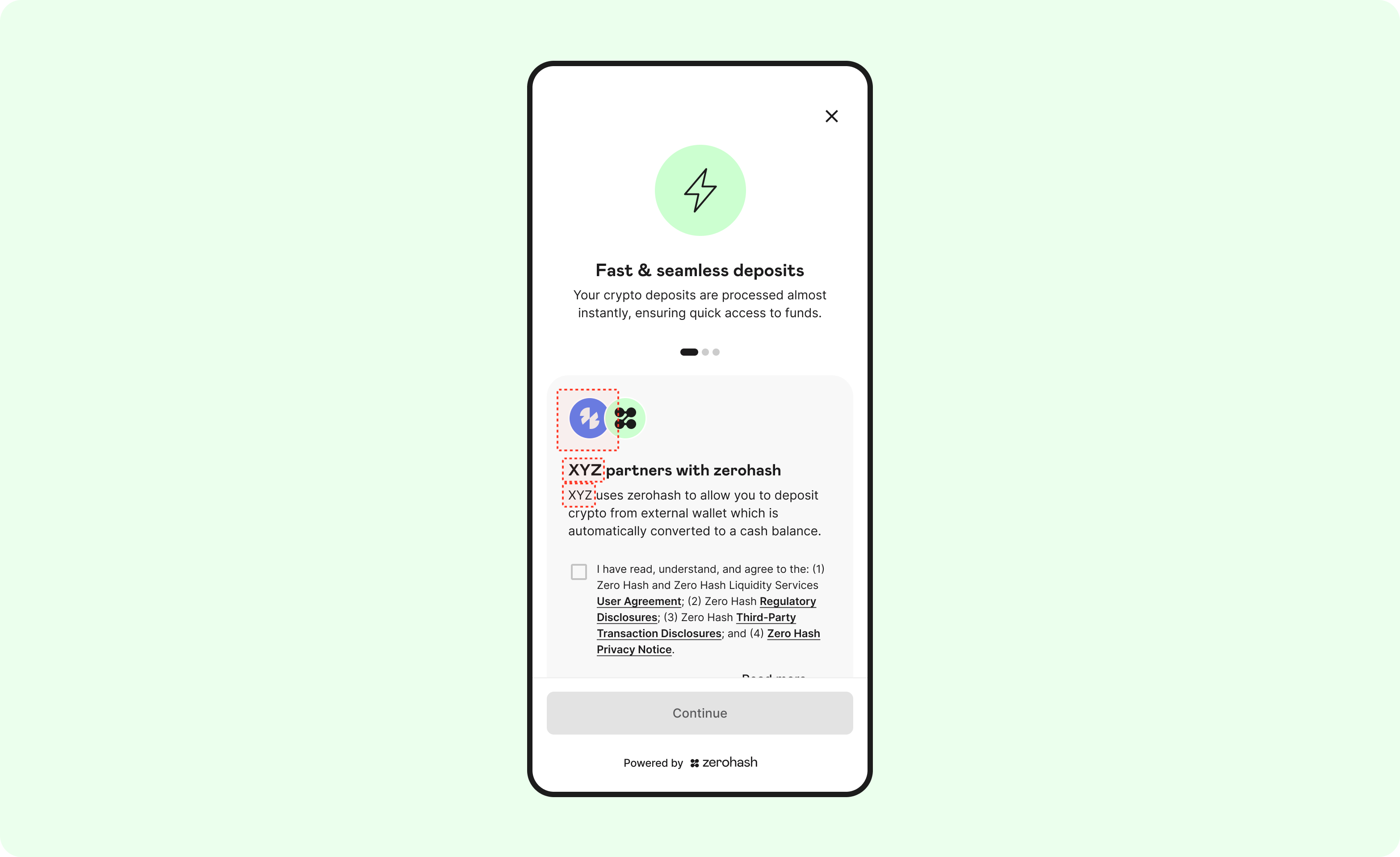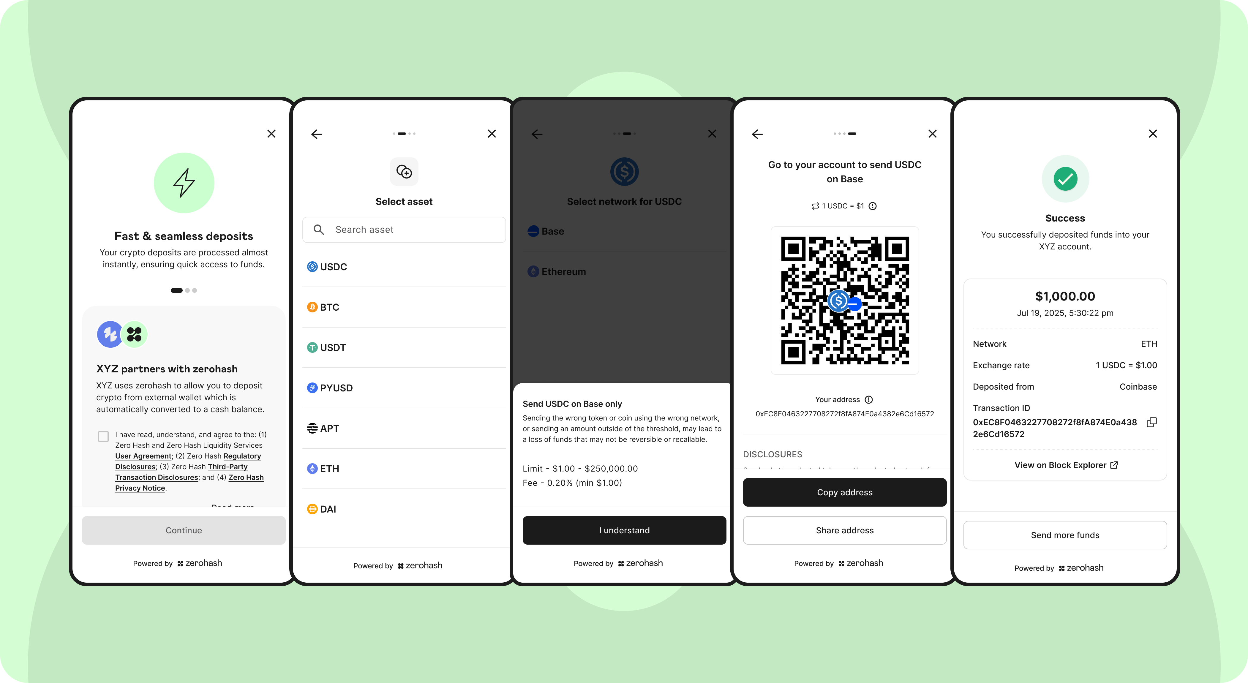 - API: leverage your own front end, using Zero Hash's Rest API on the back end.