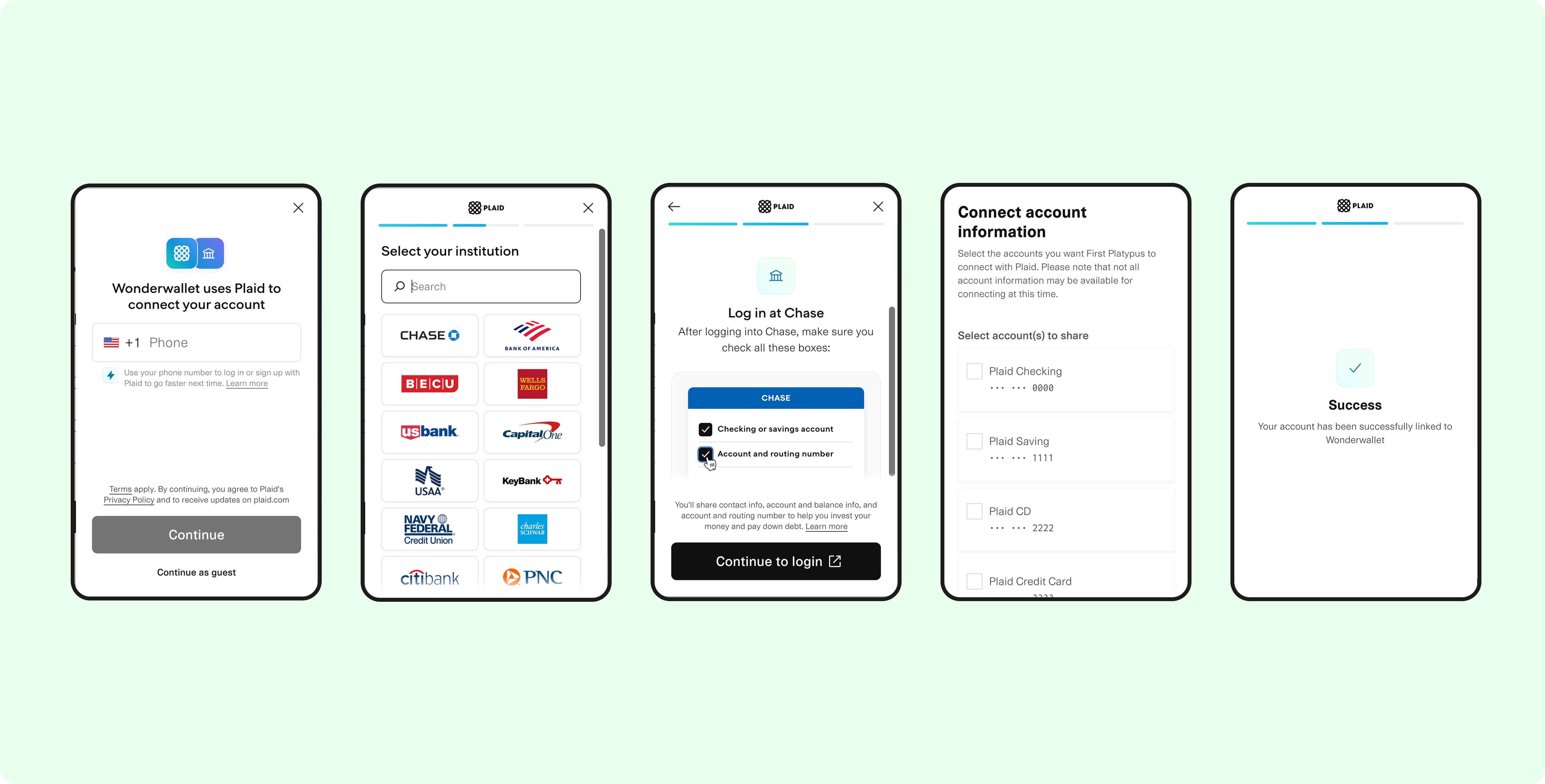 The Plaid Link UX is wrapped within the zerohash SDK, delivering a streamlined bank account verification and linking process for end customers.