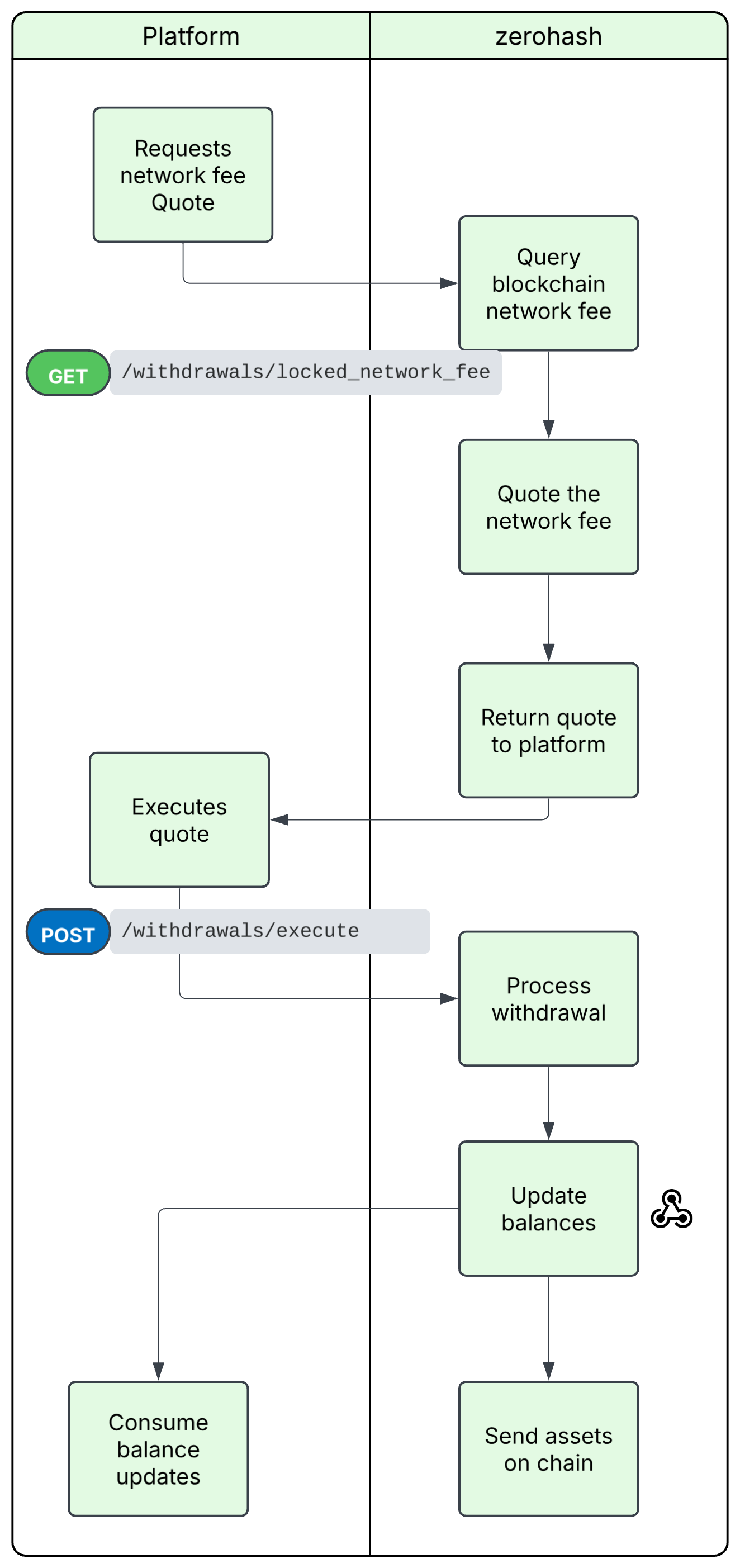 To provide cost certainty in a volatile gas environment, withdrawals follow a two-step "Lock and Execute" pattern. This ensures that the network fees and platform-specific withdrawal fees are guaranteed for a specific window of time.